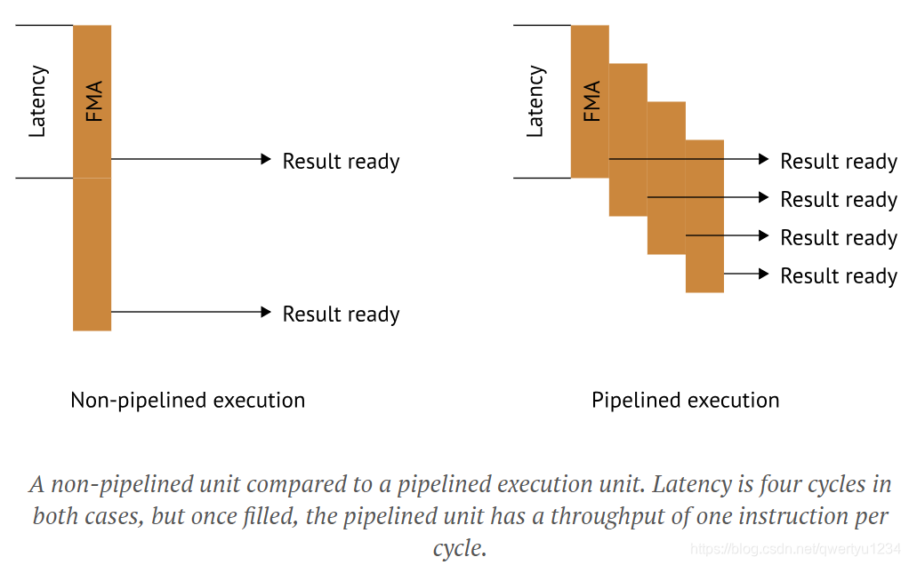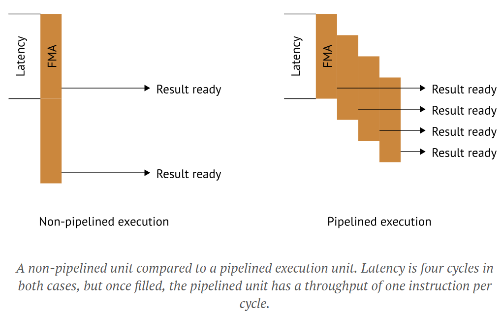 Latency doesn't equal throughput, though. An instruction with a latency of four can still have a throughput of one, if it's properly pipelined. Let's look at an example:
