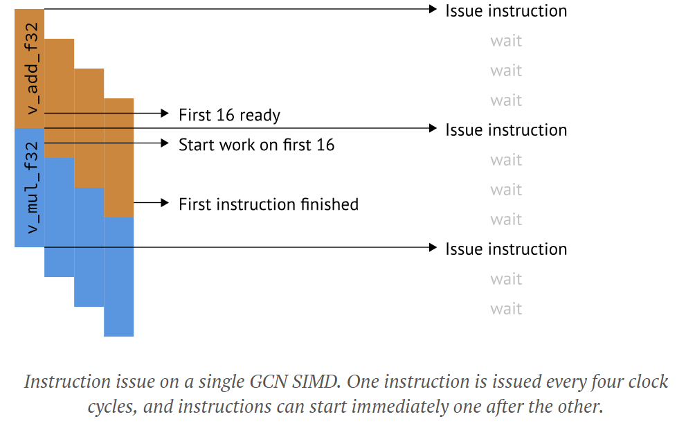 We have a dependency between the first and the second instruction -- the second instruction cannot start before the first has finished, as it needs to wait for r0 to be ready. This means we'd have to stall for three cycles before we issue another instruction. The GCN architects solved this by issuing one instruction to a SIMD every four cycles. Additionally, instead of executing one operation on 16 elements and then switching to the next instruction, GCN runs the sameinstruction four times on a total of 64 elements. The only real change this requires to the hardware is to make the registers wider than the SIMD unit. Now, you never have to wait, as by the time the v_mul_f32 starts on the first 16 elements, the v_add_f32 just finished them: