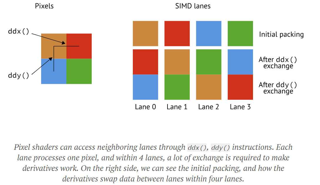 So much for the scalar unit, let's turn to the vector unit, because things get really funny here. Turns out, pixel shaders have a huge impact on compute, because they force the hardware to do something really funky -- make lanes talk to each other. Everything we learned so far about GPUs said you can't talk across lanes except through LDS, or by broadcasting something through scalar registers (or read a single lane.) Turns out, pixel shaders have a very unique requirement -- they require derivatives. GPUs implement derivatives by using quads, i.e. 2×2 pixels, and exchange data between them in a dynamically varying way. Mind blown?