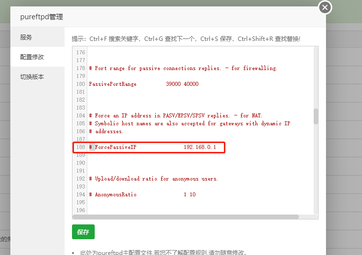 第三步、找到宝塔安装的软件列表,Pure-Ftpd 点击设置配置修改,搜索 ForcePassiveIP 把前面的 # 去掉,然后把后面的 IP更改为 自己服务器IP即可