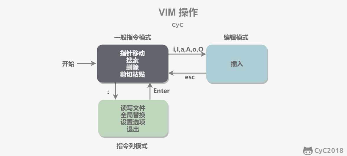 - 一般指令模式(Command mode):VIM 的默认模式,可以用于移动游标查看内容;