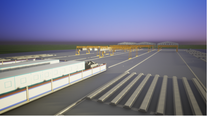 针对数字孪生的需求,确定了以UE4引擎为平台,采用webUI界面连接系统各个模块,实现数字孪生需求。在数字孪生的指挥大屏上,可以实时看到存梁的情况,产能,库容、原材等资源的负荷情况;计划与实际的对比情况;生产线实时位置情况等所有实时及历史生产信息。