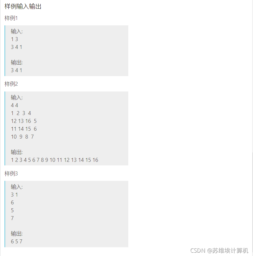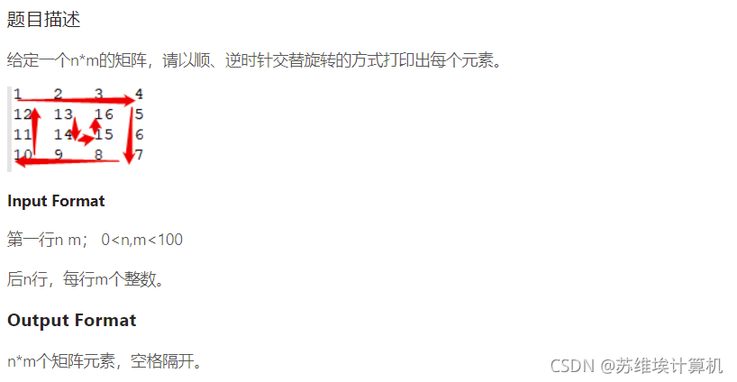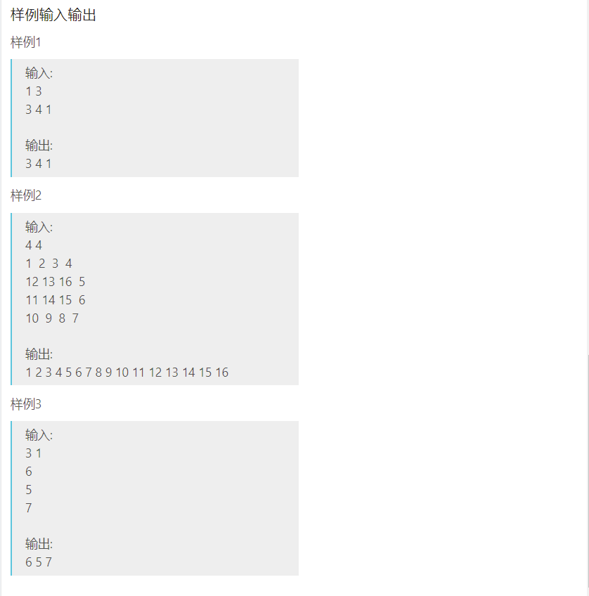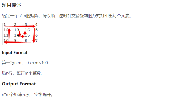 {int cal = 1;//记录第几圈 奇数就是顺指针 偶数就是逆时针vector>V;//V是二维数组int row, col;cin >> row >> col;for (int i = 0; i < row; i++){vectorv;for (int j = 0; j < col; j++){int val;cin >> val;v.push_back(val);}V.push_back(v);}//输出整个矩阵//for (int i = 0; i < row; i++)//{// for (int j = 0; j < col; j++)// {// cout << V[i][j]<<" ";// }// cout << endl;////}int top = 0, bottle = row - 1, left = 0, right = col - 1;//记录矩阵边界 遍历一行/一列 边界减小//这个循环条件为什么要+1 自己模拟一下 如果不+1 一次遍历完之后 会有一行还没遍历上就退出循环了while (top != bottle + 1 || right != left - 1){//顺时针if (cal % 2 != 0){for (int i = left; i <= right; i++)//从左到右{cout << V[top][i] << " ";}top++;if (top == bottle + 1 || right == left - 1)break;for (int i = top; i <= bottle; i++)//从上到下{cout << V[i][right] << " ";}right--;if (top == bottle + 1 || right == left - 1)break;for (int i = right; i >= left; i--)//从右到左{cout << V[bottle][i] << " ";}bottle--;if (top == bottle + 1 || right == left - 1)break;for (int i = bottle; i >= top; i--)//从下到上{cout << V[i][left] << " ";}left++;cal++;}//逆时针 (偶数圈 如果还可以继续遍历的话)else{for (int i = top; i <= bottle; i++)//从上到下{cout << V[i][left] << " ";}left++;if (top == bottle + 1 || right == left - 1)break;for (int i = left; i <= right; i++)//从左到右{cout << V[bottle][i] << " ";}bottle--;if (top == bottle + 1 || right == left - 1)break;for (int i = bottle; i >= top; i--)//从下到上{cout << V[i][right] << " ";}right--;if (top == bottle + 1 || right == left - 1)break;for (int i = right; i >= left; i--)//从右到左{cout << V[top][i] << " ";}top++;cal++;}}return 0;