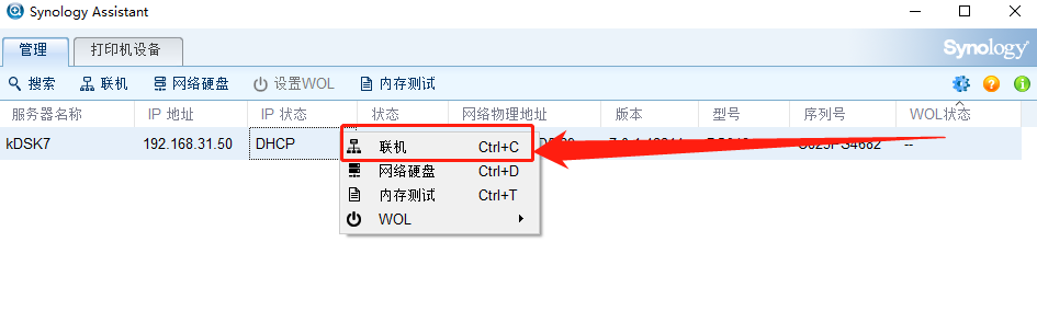 在Synology Assistant完成安装后,点击进入程序,就能看到我们之前设置的群晖硬件,这时我们右键点击该设备,点选“联机”选项。在Synology Assistant与硬件联机后,就能进入安装程序。