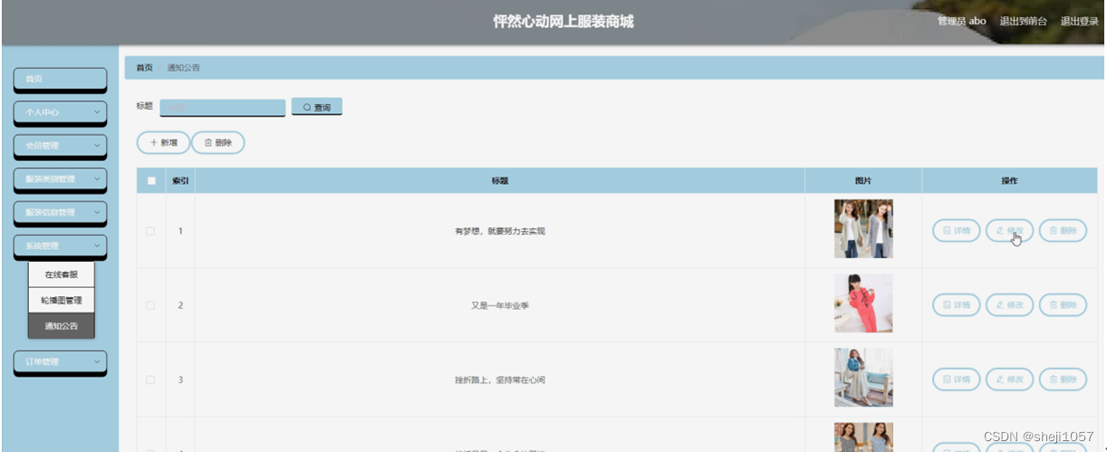 系统管理,在通知公告页面可以对索引,标题,图片等内容进行详情,修改和删除等操作,还可对在线客服,轮播图管理进行详细操作,如图5-11所示。