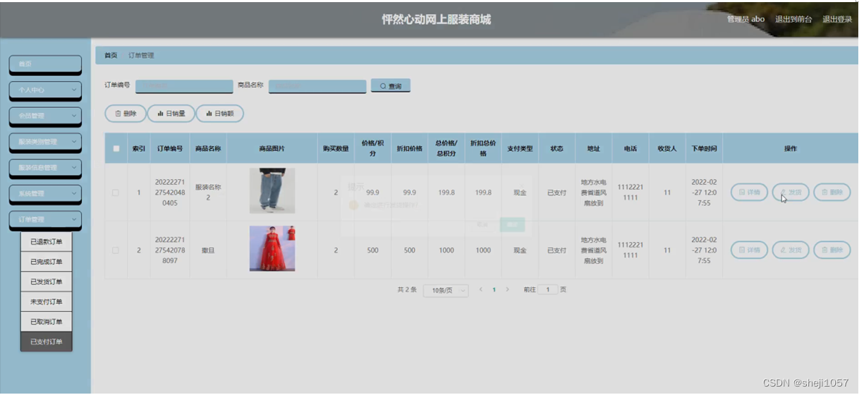 订单管理,在已支付订单页面可以对索引,订单编号,商品名称,商品图片,购买数量,价格/积分,折扣价格,总价格/总积分,折扣总价格,支付类型,状态,地址,电话,收货人,下单时间等内容进行详情,发货和删除等操作,还可对已退款订单,已完成订单,已发货订单,未支付订单,已取消订单进行详细操作,如图5-12所示。