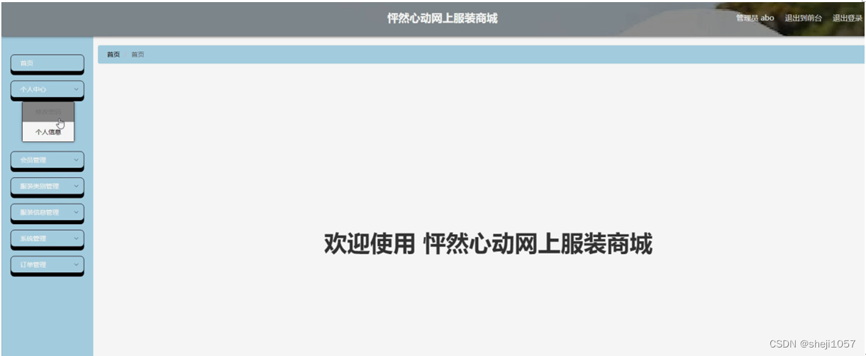 管理员登录系统后,可以对首页,个人中心,会员管理,服装类别管理,服装信息管理,系统管理,订单管理等功能进行相应的操作管理,如图5-7所示。