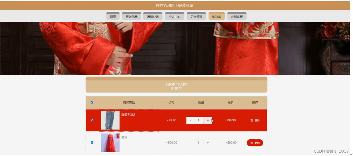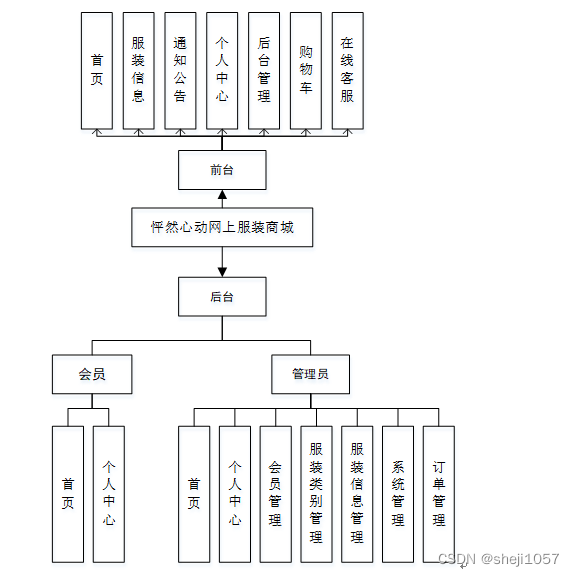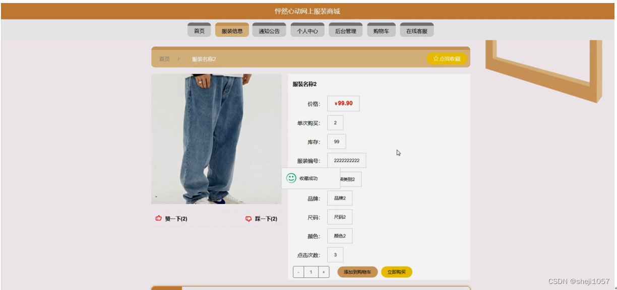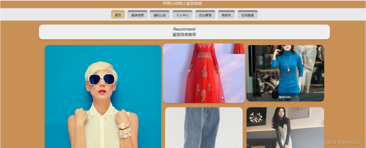 怦然心动网上服装商城,在系统首页可以查看首页,服装信息,通知公告,个人中心,后台管理,购物车,在线客服等内容进行详细操作,如图5-1所示。