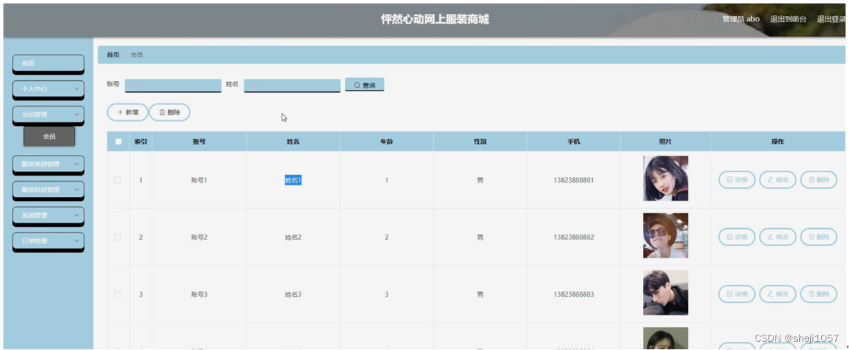 会员管理,在会员管理页面可以对索引,账号,姓名,年龄,性别,手机,照片等内容进行详情,修改和删除等操作,如图5-8所示。