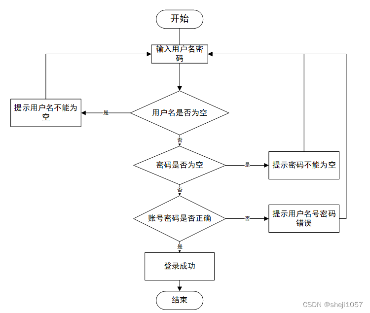 运行流程主要为输入用户名密码,并且不能为空,若为空则提示不能为空,用户名和密码全部输对即可登入成功,主要流程如图3-2。
