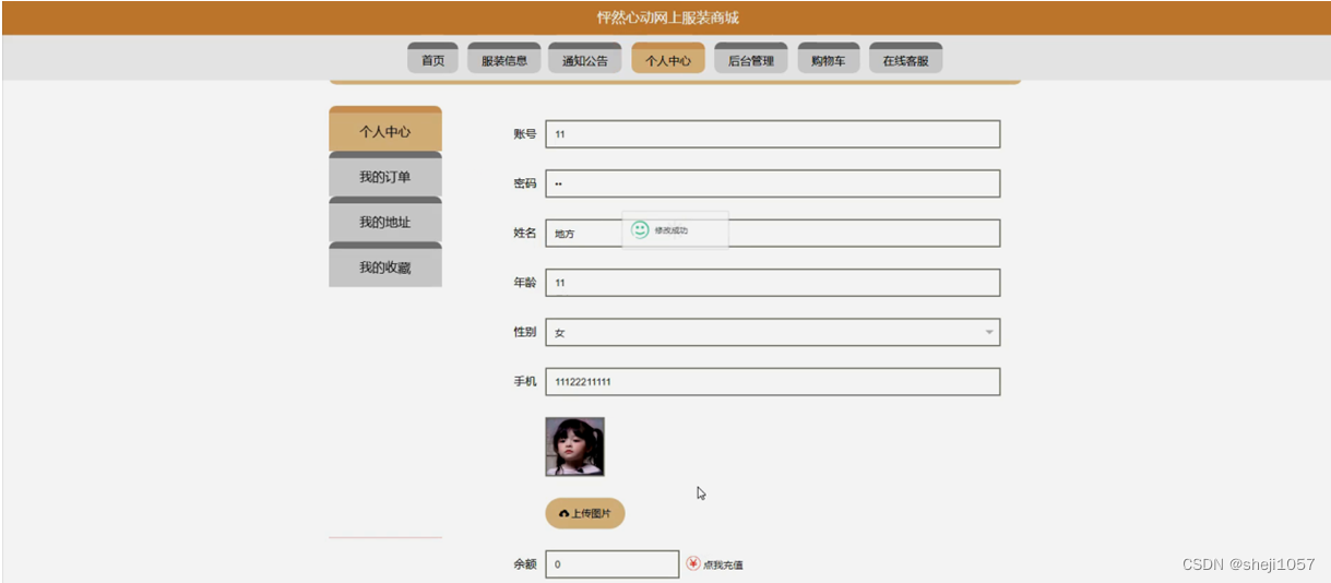 个人中心,在个人中心页面通过填写账号,密码,姓名,年龄,性别,手机,上传图片,余额等内容进行更新信息,根据需要对我的订单,我的地址,我的收藏进行相对应操作,如图5-4所示。