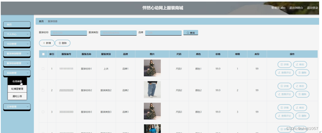 服装信息管理,在服装信息管理页面可以对索引,服装编号,服装名称,服装类别,品牌,图片,尺码,颜色,价格,单限,库存等内容进行详情,查看评论,修改和删除等操作,如图5-10所示。