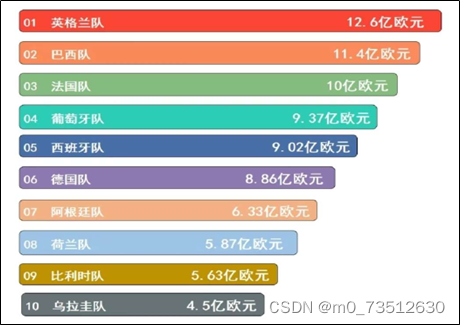 从世界杯各个国家球队身价条形图可知,排在前五的是英格兰队、巴西队、法国队和葡萄牙队,分别是在十亿欧元左右。然而,需要注意的是球员身价是动态变化的,受到众多因素的影响,不过这也能帮助我们预测下一届的冠军,大概率会从前几名之中产生。