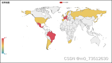 HostCountry=[[i,HostCountry[i]] for i in HostCountry]c=(Map(init_opts=opts.InitOpts(width='1150px')).add(series_name="举办国家",data_pair=HostCountry,maptype="world",)# 全局配置项.set_global_opts(# 设置标题title_opts=opts.TitleOpts(title="举办世界杯国家的世界地图"),# 设置标准显示visualmap_opts=opts.VisualMapOpts(max_=2, is_piecewise=False),)# 系列配置项.set_series_opts(# 标签名称显示,默认为Truelabel_opts=opts.LabelOpts(is_show=False, color="blue"),showLegendSymbol=False)# 生成本地html文件.render("举办过世界杯的国家.html"))