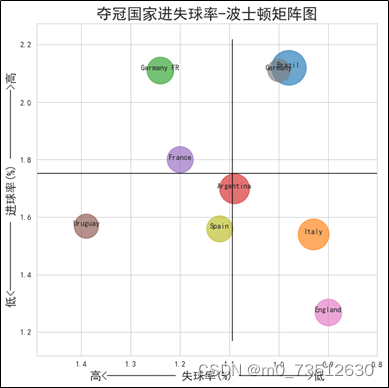 plt.title("夺冠国家进失球率-波士顿矩阵图", fontsize=20)