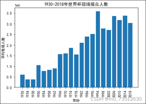 从图中可以看出,世界杯观众人数整体总体是上升的,从最初只有30万人到2018年有300多万人现场观看,上涨了近5倍,其中在1934年现场人数最少,只有36万人左右,观众总数最多的一届是1994年的美国世界杯。其次,世界杯现场观众人数的总量已经从1930年的约590,000人增长到了2018年的超过3300万人。这反映了足球运动在全球越来越受欢迎和普及的趋势。然而,需要注意的是,该数字并不包括通过电视和互联网观看比赛的人数,因此实际上世界杯足球比赛所吸引的观众远远超过现场观众的数量。在世界杯历史的早期,现场观众人数相对较少,这主要是因为早期的比赛更为局部化和地区化。直到20世纪90年代,随着电视和互联网的普及,现场观众人数才开始显著增长。