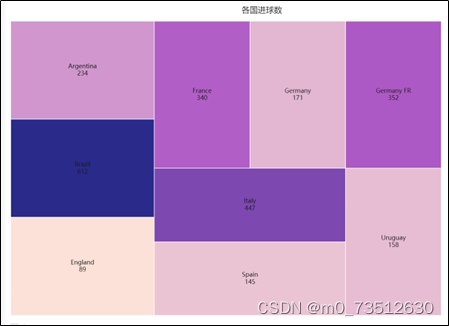 从图中可以看出,巴西是历届总进球数最多的国家,远远超过其他各国,无愧足球王国的称号,其次是德国和阿根廷等。而矩形颜色越深,说明这个国家进球的次数越多,实力比较强。
