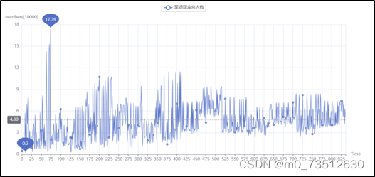c = (Line(init_opts=opts.InitOpts(width='1150px')).add_xaxis(df.index.tolist()).add_yaxis("现场观众总人数", people, is_smooth=True,markpoint_opts=opts.MarkPointOpts(data=[opts.MarkLineItem(type_='max',symbol_size = [80,50],name='max'),opts.MarkLineItem(type_='min',symbol_size = [80,50],name='min')])).set_global_opts(tooltip_opts=opts.TooltipOpts(is_show=True, trigger="axis", axis_pointer_type="cross"),xaxis_opts=opts.AxisOpts(name='Time',type_="category",axispointer_opts=opts.AxisPointerOpts(is_show=False, type_="shadow"),),yaxis_opts=opts.AxisOpts(name='numbers(10000)')).set_series_opts(label_opts=opts.LabelOpts(is_show=False)).render("此场观众总人数.html")