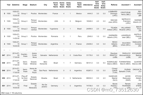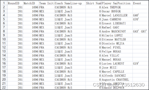 if __name__=='__main__':start = time.time()# 设置需要爬取的页数num = 3list = [1935882,351498044,390461123,99157282,60384544,9008159,8960728,71851529]for value in list:pau = get_info(url,headers,num,value)end = time.time()# 数据存储df = pd.DataFrame(df,columns=["RoundID", "MatchID", "Team Initials","Coach Name","Line-up","Shirt Number","Player Name","Position","Event"])df.to_csv('WorldCupsSummary', encoding='gb18030', index=False)
