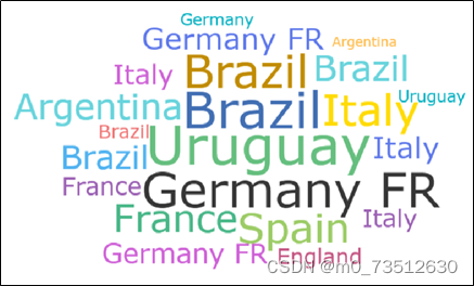 从图中可以看出,世界杯的主办方一般都在欧洲和美洲,很少会在亚洲和非洲举办,这可能跟经济实力或者国家足球实力有关,也取决于欧洲球队的综合实力以及参赛名额。从词云图可知,有的国家都举办二轮了,有的国家连一轮都没举办过,在亚洲举办的次数最少,在欧洲举办的次数是最多的,像墨西哥,巴西,法国等都举办了两次了。