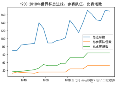 接下来,我们绘制了1930-2018年世界杯总进球、参赛队伍、比赛场数折线图。
