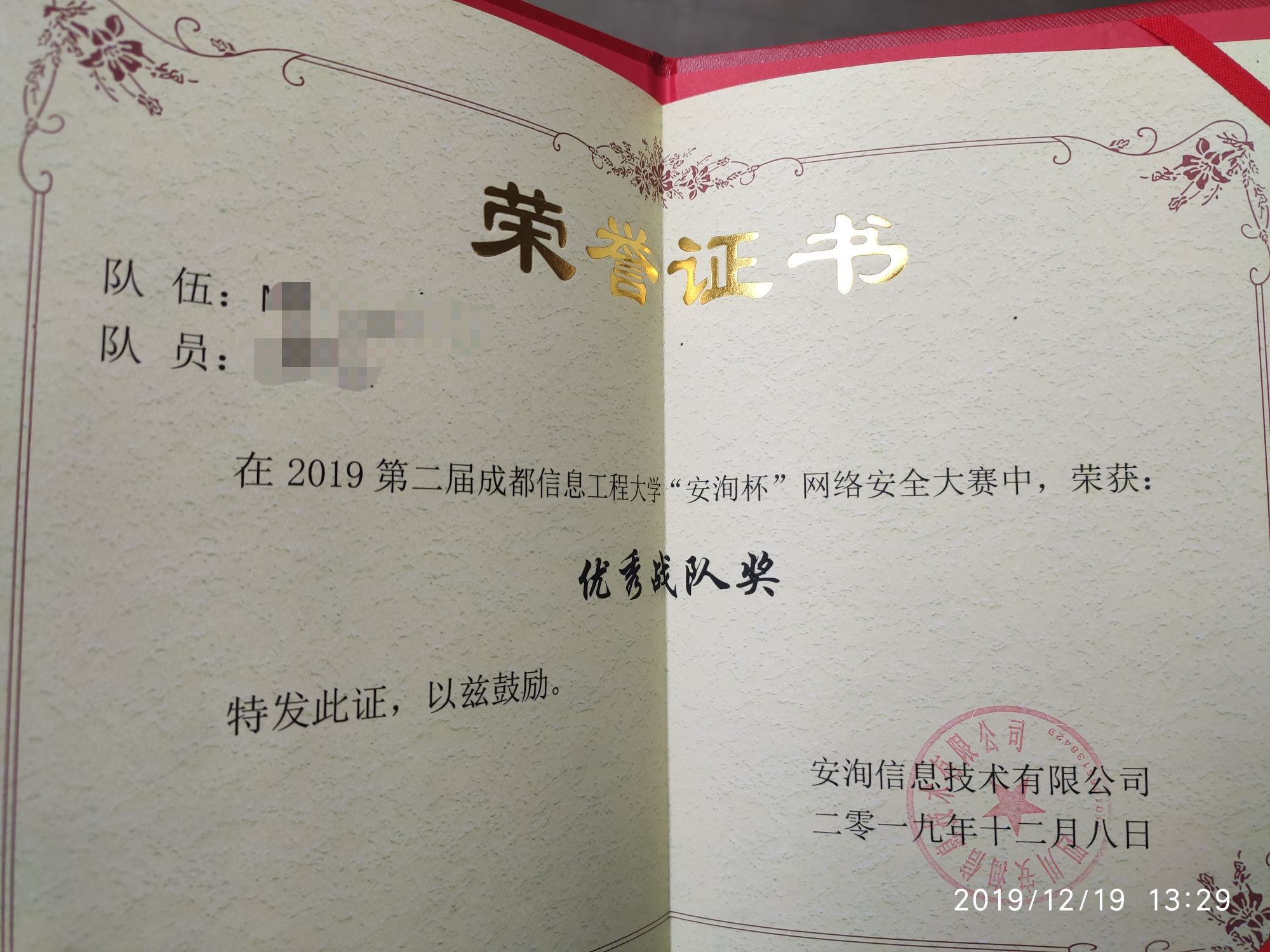 12月份,有幸到成都参加了“安洵杯”线下赛,收获了信安方面的第一个奖状。