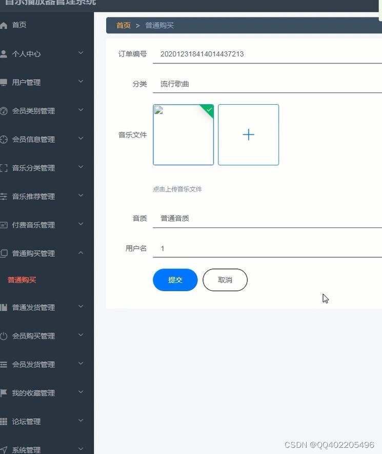 普通购买管理,在普通购买管理列表中通过填写订单编号、歌名、分类、歌手、价格、购买日期、用户名、昵称、是否支付等信息并删除