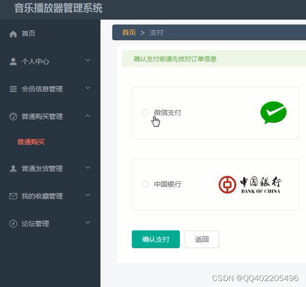 用户登录进入音乐播放器管理系统可以查看会员信息管理、普通购买管理、普通发货管理、我的收藏管理、论坛管理等内容