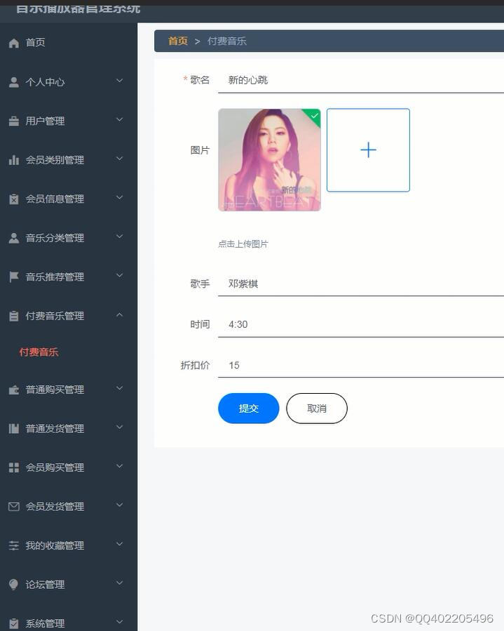 付费音乐管理,在付费音乐管理列表可以查看歌名、分类、图片、歌手、专辑、时间、价格、折扣价等内容,并且根据需要进行修改或删除等操作