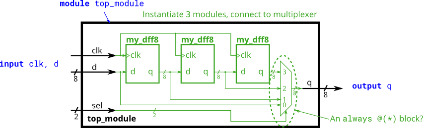 您将获得一个具有两个输入和一个输出的模块(实现一组8 D触发器)。实例化其中三个,然后将它们链接在一起,形成长度为 3 的 8 位宽移位寄存器。此外,创建一个4对1多路复用器(未提供),根据以下因素选择要输出的内容:输入d处的值,第一个,第二个D之后或第三个D触发器之后的值。(实质上,选择延迟输入的周期数,从零到三个时钟周期。my_dff8sel[1:0]sel
