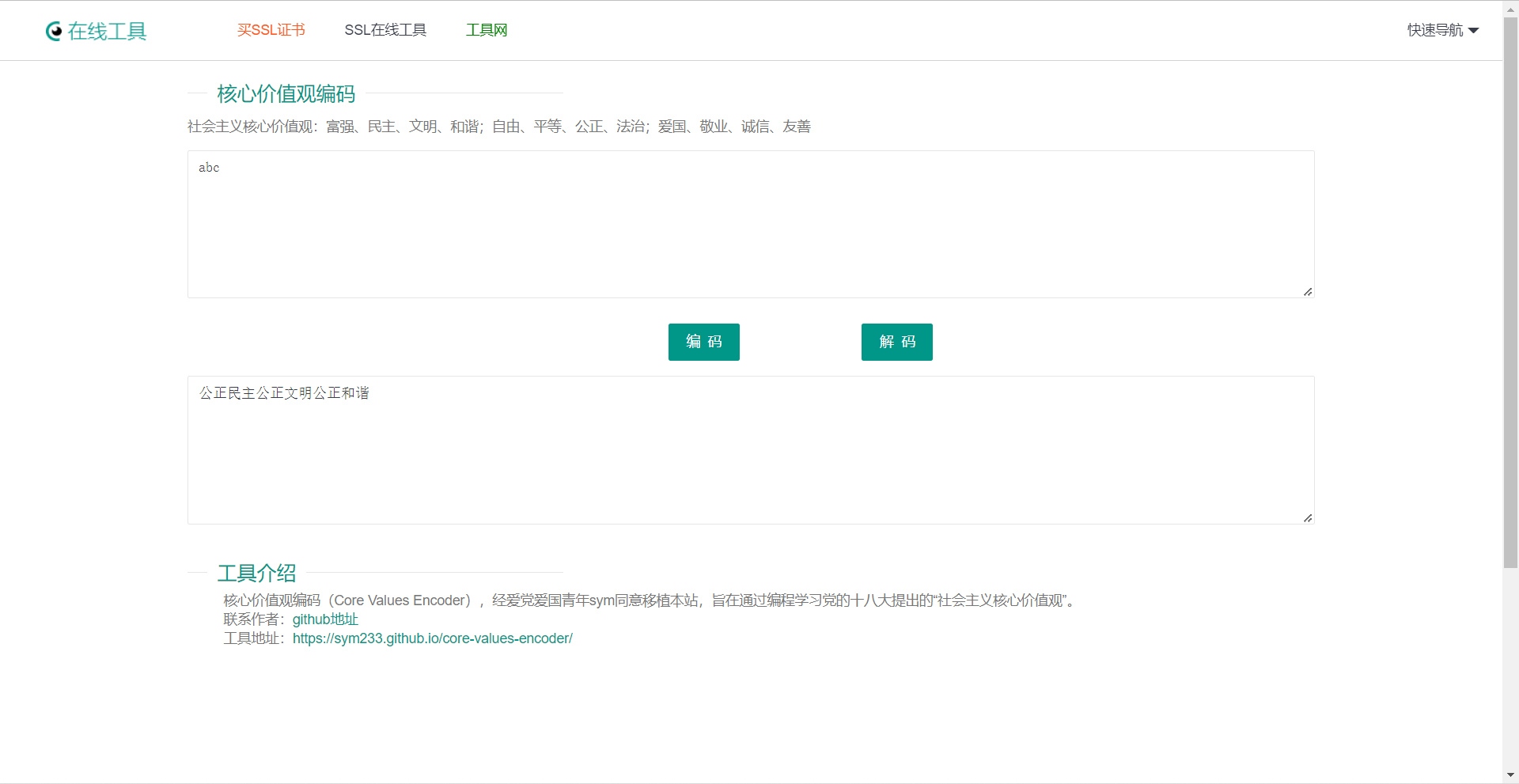 打开网址:CTF在线工具-在线核心价值观编码|核心价值观编码算法|Core Values Encoder (hiencode.com)