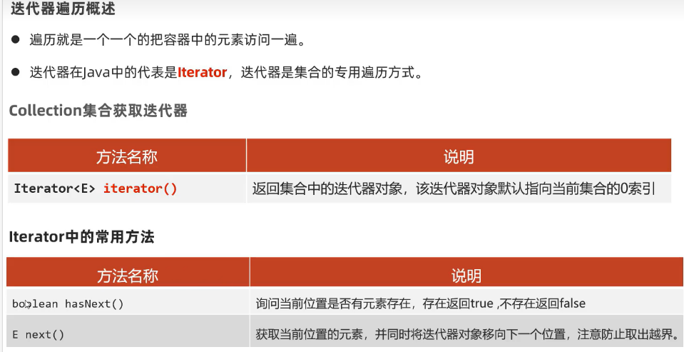 Iterator it =lists.iterator(); //1.得到当前集合的迭代器对象String ele=it.next();System.out.println(ele); //2.从索引为0的位置开始往后遍历,每次输出一个System.out.println(it.next()); //3.超出集合长度会报错!!!//NoSuchElementException