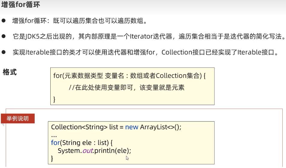 ---------------------------------------------------------------------while(it.hasNext()){String ele2=it.next(); //4.while循环遍历System.out.println(ele2); 但要注意,两种方法不能混用,因为任意一种都可以遍历完成。