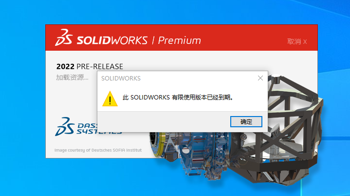 近一段时间有客户反应有关2022新版本试用过期的问题,具体显示为“次SOLIDWORKS有限使用版本已经到期”点击“确定”后自动关闭程序,无法启动软件。如下图: