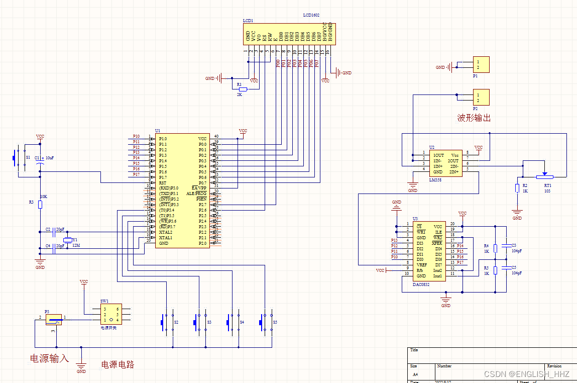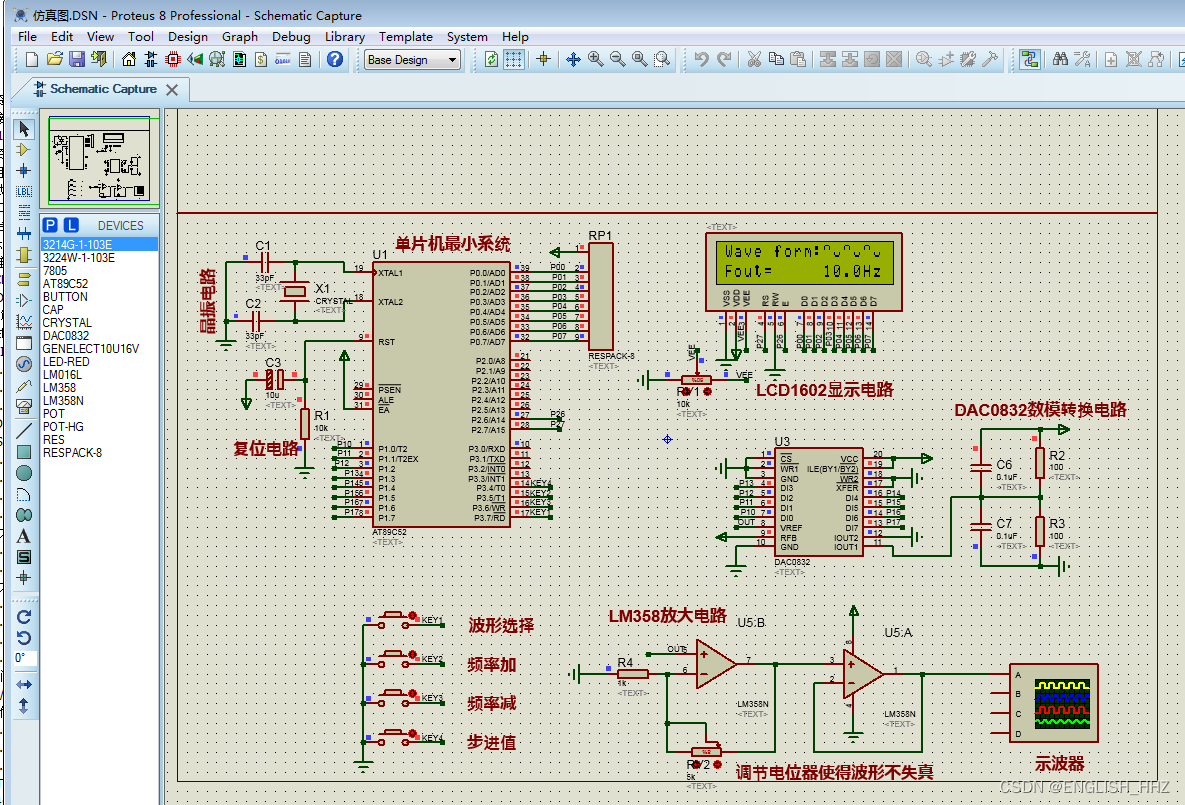 硬件组成:本系统采用51单片机+LCD1602+DAC0832+按键等而成。