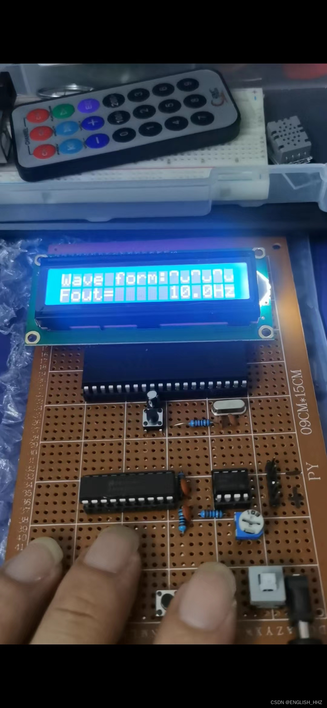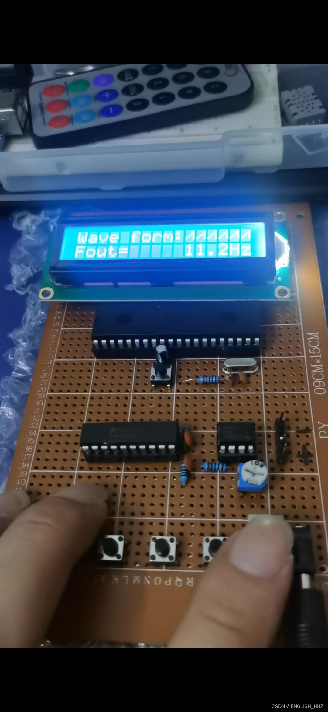3.通过1602液晶显示波形和输出频率,频率范围为10-100HZ。