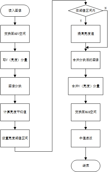 本方案采用图像分块、设置亮度阈值区间的方法整体提高图像亮度值进行恢复逆光图像。具体实现流程如下: