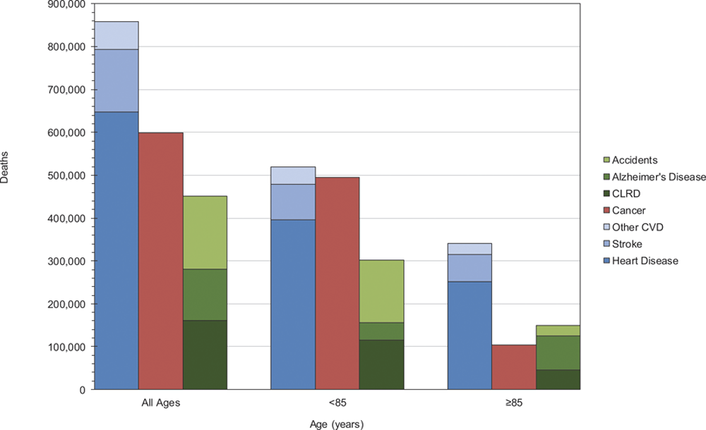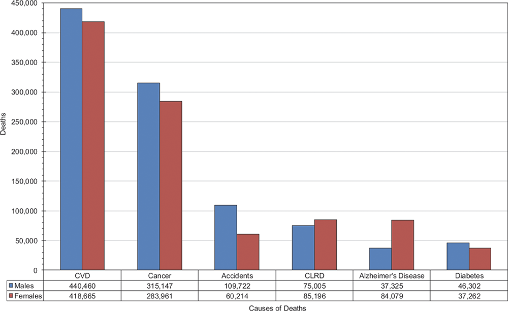 图3 美国所有男性和女性的CVD主要死因。CVD(心血管疾病);Cancer(癌症);Accidents(事故);CLRD(慢性下呼吸道);Alzheimer's Disease(阿尔茨海默氏病),Diabetes(糖尿病)。