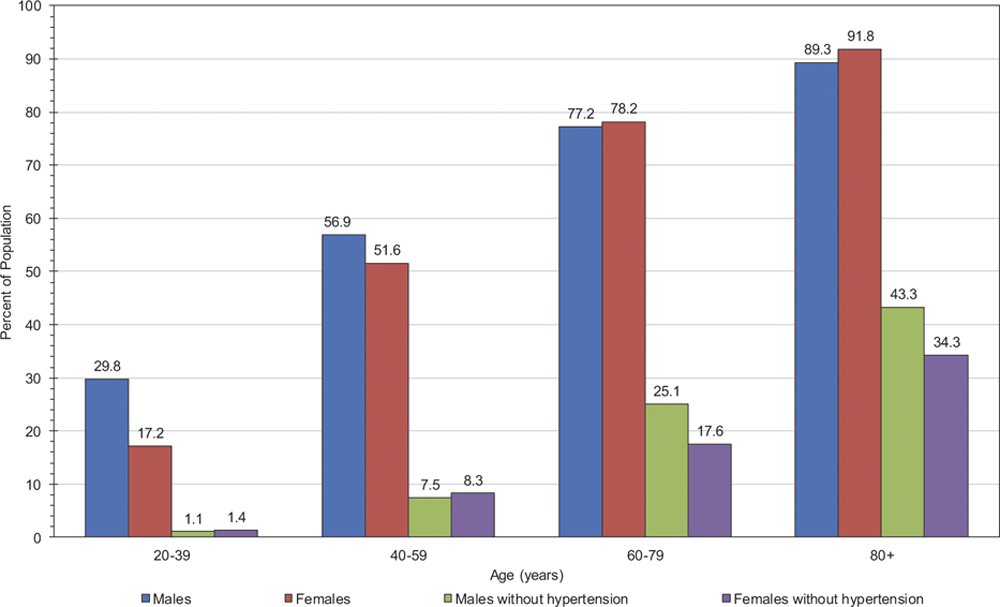 根据美国卫生研究中心不完全数据统计, 2013到2016年,美国心血管疾病的成人(≥20岁)患病率(包括冠心病,心衰,中风和高血压)是48.0%(1.215亿,2016年)。且不论是男性还是女性,该患病率随着年龄的增加而增加。