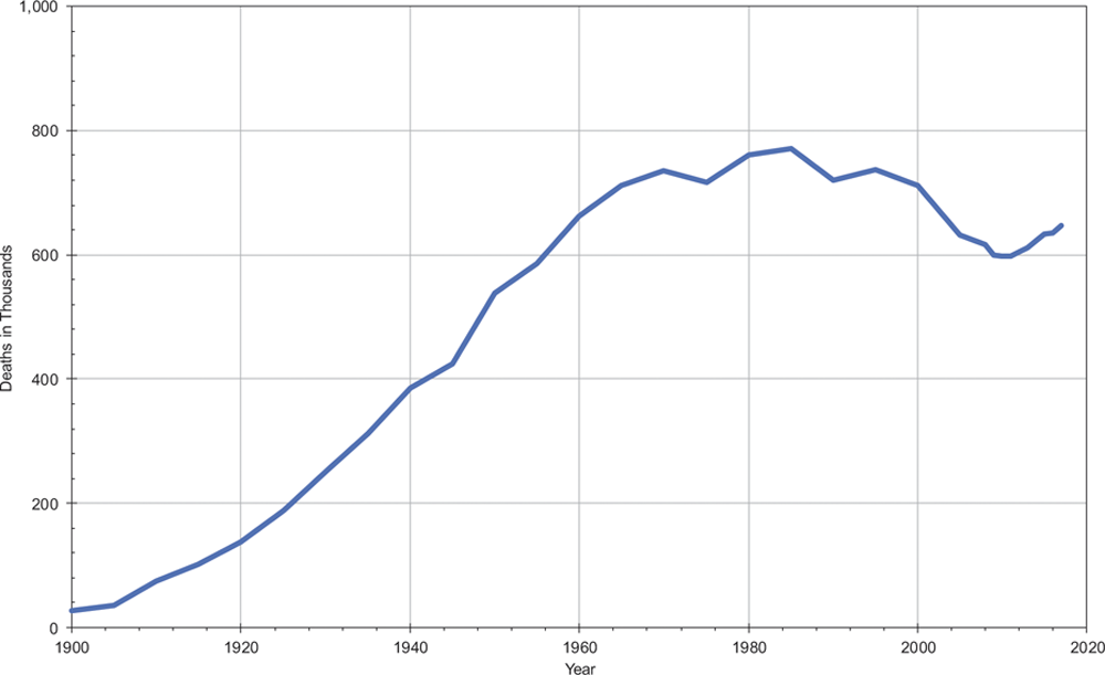 我们统计了1900年到2020年,心血管疾病的死亡人数。从图表我们不难发现,在1900年代至1980年代,美国因心血管疾病(心脏病,心肌梗塞等)引起的死亡人数稳步上升,而随着医疗的发展,到2010年代其死亡人数则有所下降。