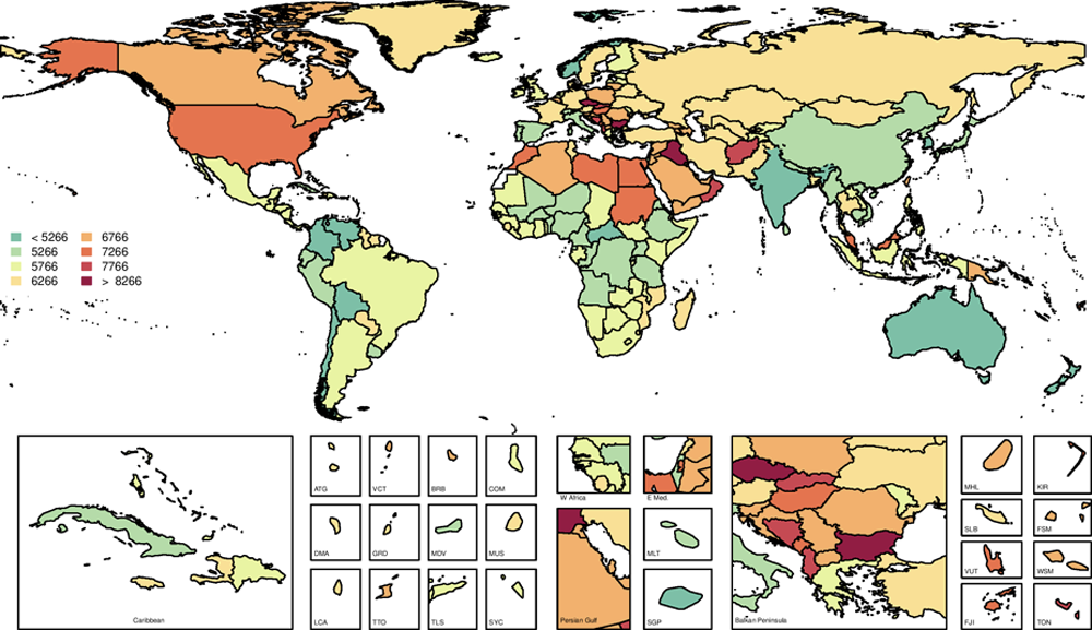 我们统计了 2017年全球每10万人心血管疾病患病率,发现在美国,中欧,北非和中东心血管疾病患病率很高。