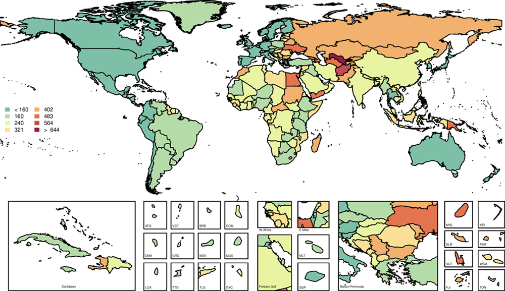 我们统计了 2017年全球每10万人心血管疾病死亡率,发现在东欧中亚心血管疾病死亡率很高。