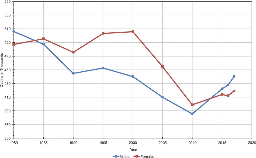 图7 1980年至2017年美国男性和女性的心血管疾病(CVD)死亡率趋势。