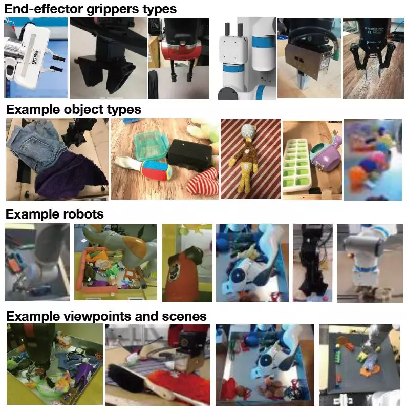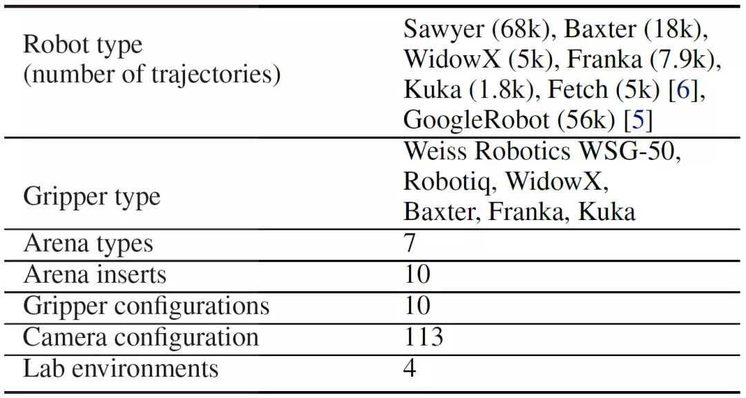 RobotNet项目的一大特点就是数据全部来源于真实机器人实际环境运行采集(也是土豪风),包含7种机器人平台,1500万视频帧,主要是学习基于视觉的机器人操作能力。毕竟,大部分机器人领域的研究,最终还是要在实际环境真机测试才有说服力的。