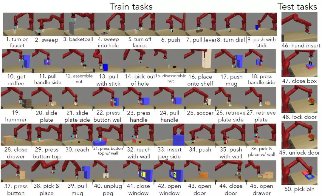Meta-World是伯克利开源的一个benchmark,基于Mujoco,主要关注Meta-RL和多任务学习,设计了50个机器人抓取任务。