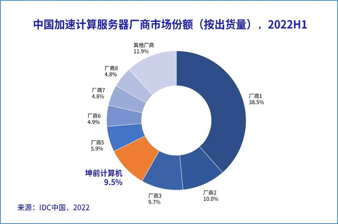 从同构到异构,从串行到并行,各行业都依赖于加速计算来应对更多数据的处理需求。在IDC发布的《2022中国半年度加速计算市场分析报告》中,2022上半年中国加速服务器市场规模达到30亿美元,坤前计算机凭借9.5%的市场份额位居榜单第四位。