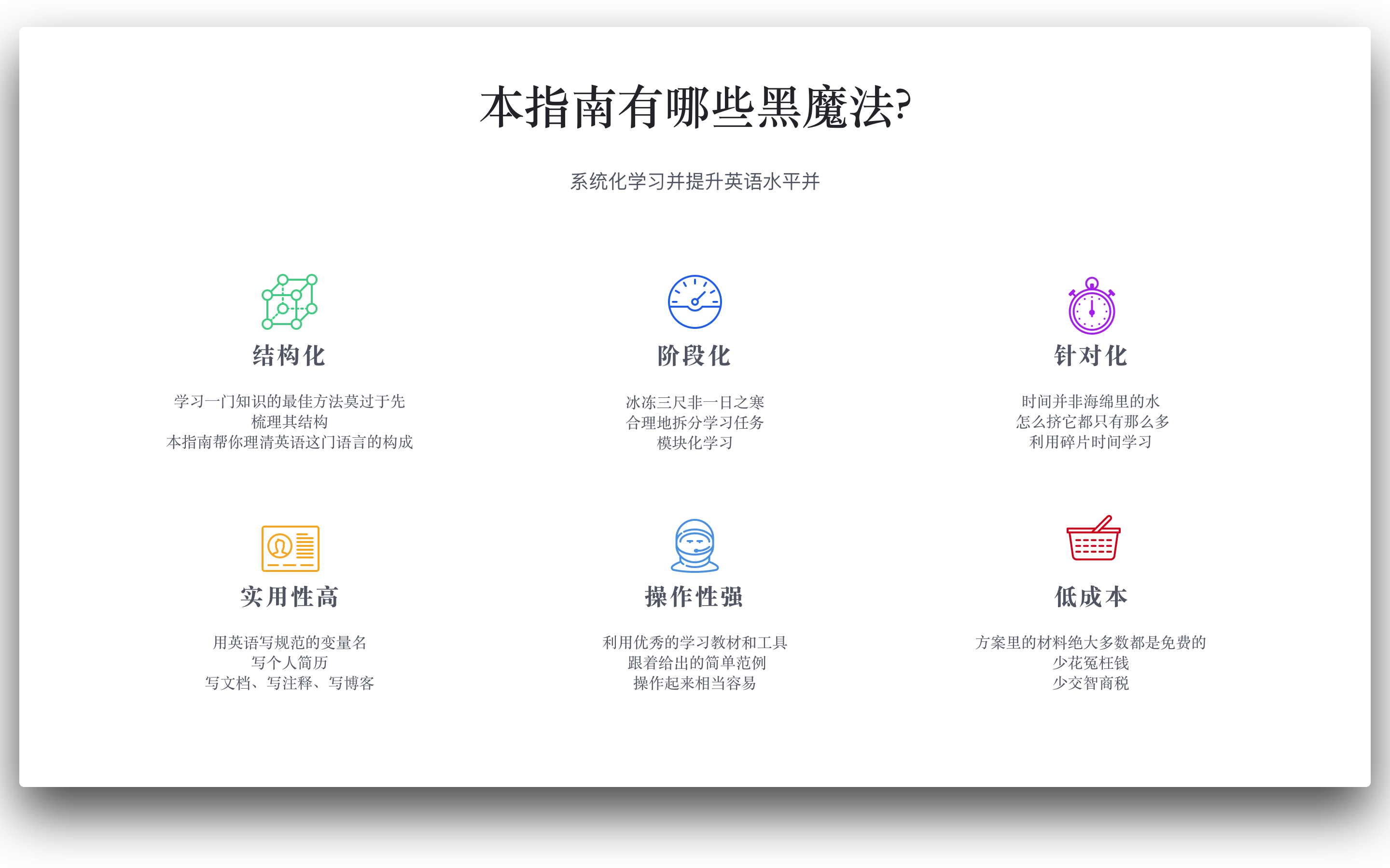 英语是程序员绕不过去的一项技能,虽然我们可能从小学就开始接触英语了,但直到毕业工作,英语能够不成为学习障碍还是一件不容易的事情。这其中的差别很大成分可以归结为学习方法,这份文档就是这样一个注重方法和可操作性的英语学习指南。
