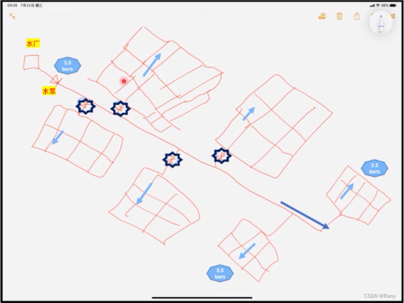 假设供水压力到入户网要达到2.5bars,25米水头。在未实施供水压力管理前,若供水压力出厂为2.5bars,因水头损失,最后入户只有1.0bars,要保证入户网达到2.5bars,那么出厂压力需大于4.0bars。