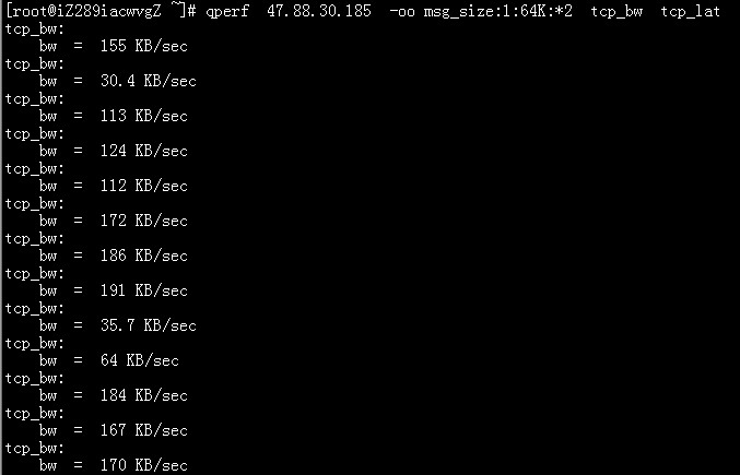 # qperf xx.xx.xx.xx -oo msg_size:1:64K:*2 tcp_bw tcp_lat