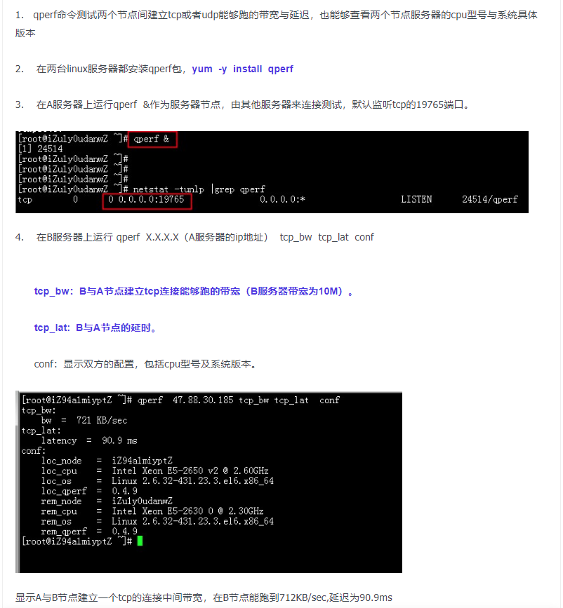 在一台服务器上运行qperf &作为服务器节点,由其他服务器来连接测试,默认监听tcp的19765端口。